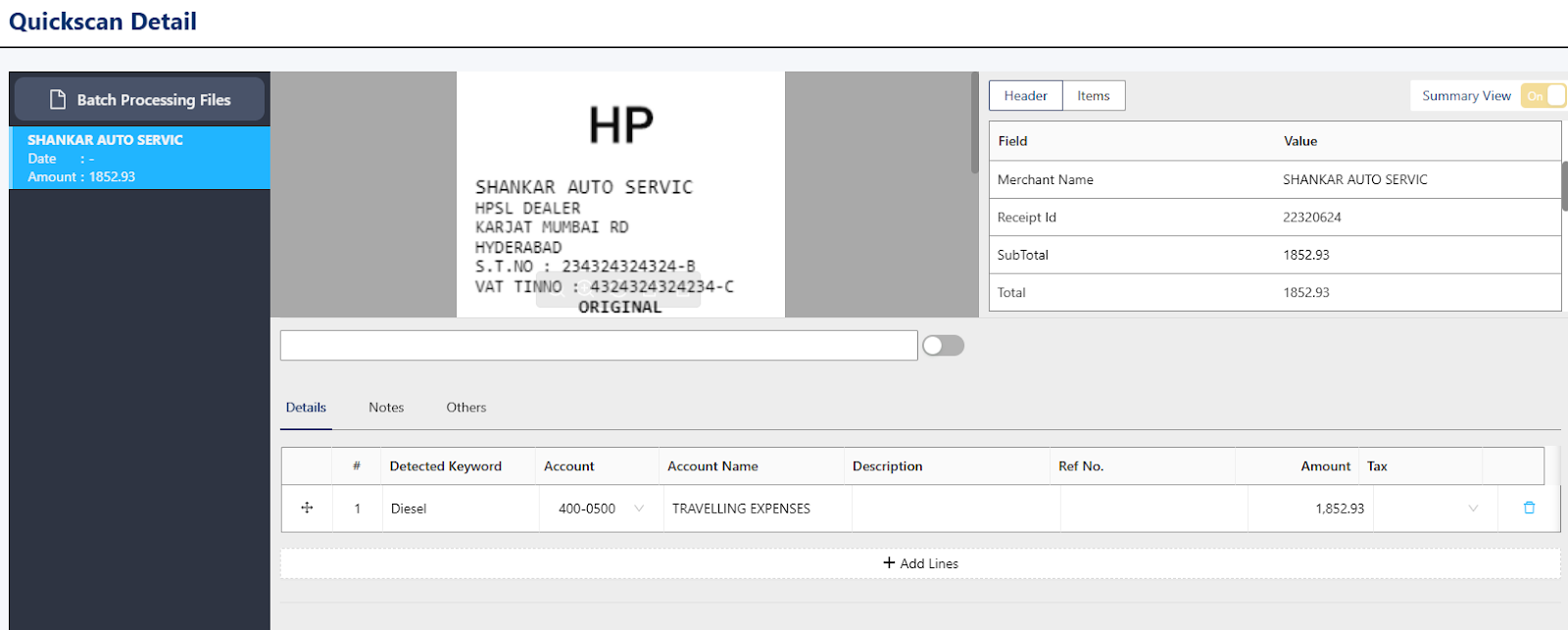 Diesel was detected and automatically tagged 'Travelling Expenses'.