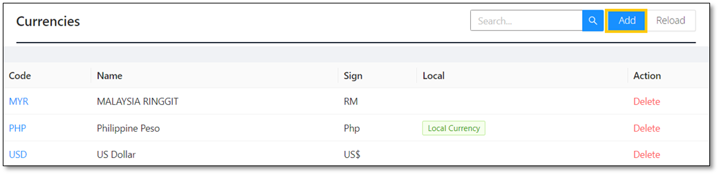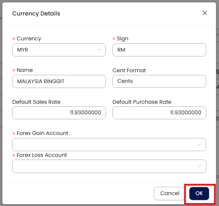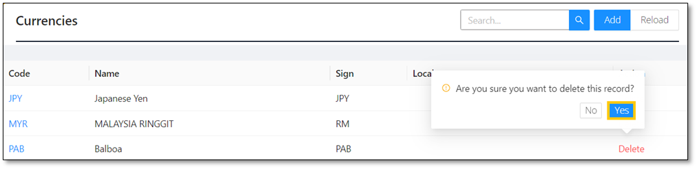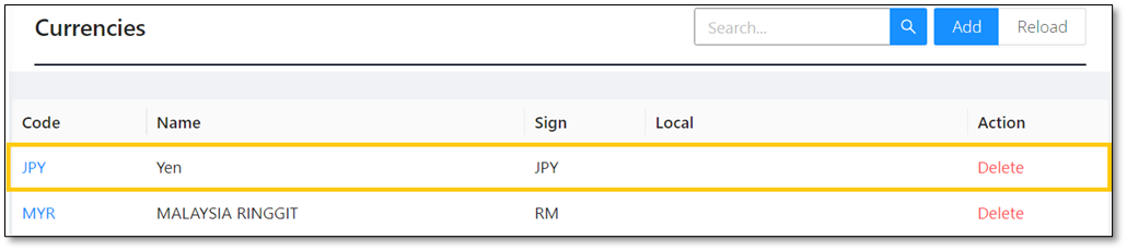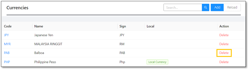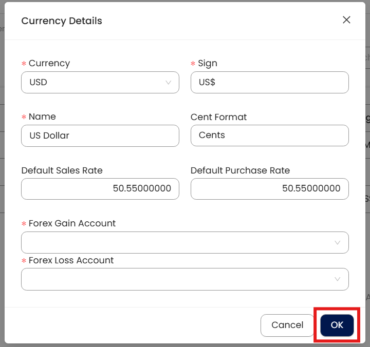 Note: Currency deletion is allowed as long as it is not used in any transactions and is not associated with any customer or supplier.