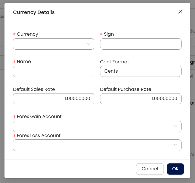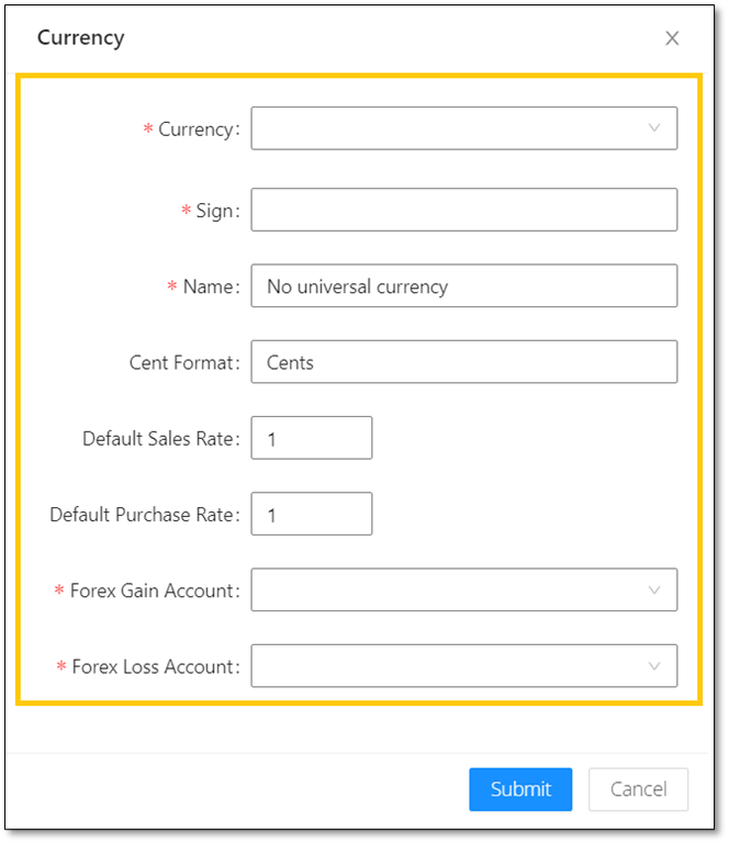 Currency: This is a required field that displays all available currencies along with their corresponding sign.