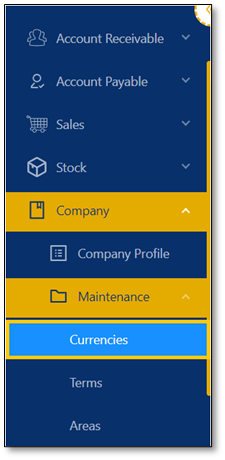 1. In Navigation pane, go to Company > Maintenance > Currencies