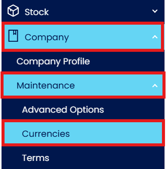In Navigation pane, go to Company > Maintenance > Currencies
