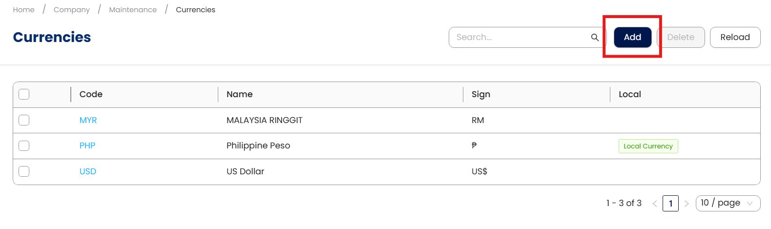 In the Currency List View, click Add