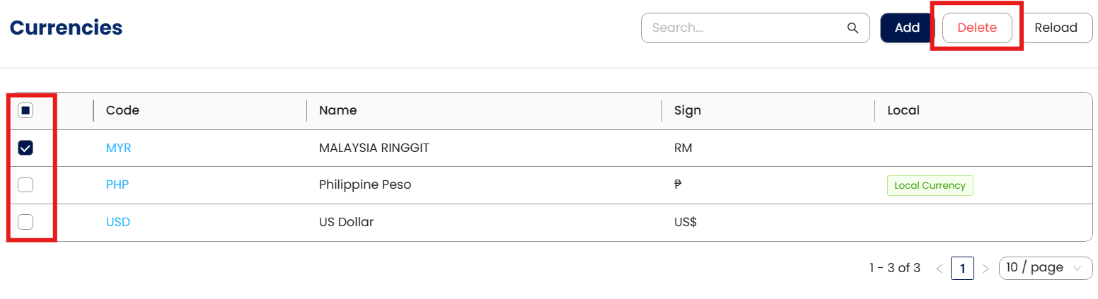 In the Currency List View, tick the checkbox beside the item you wish to delete. Then click Delete.