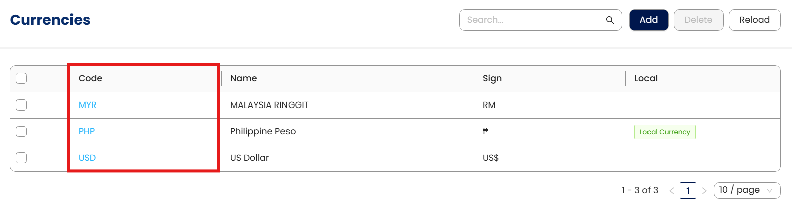 In the Currency List View, click Code to open.