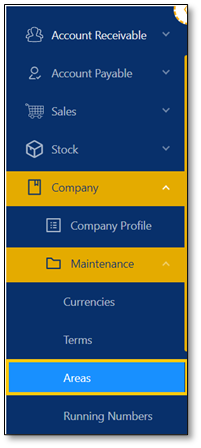 1. In Navigation pane, go to Company > Maintenance > Areas