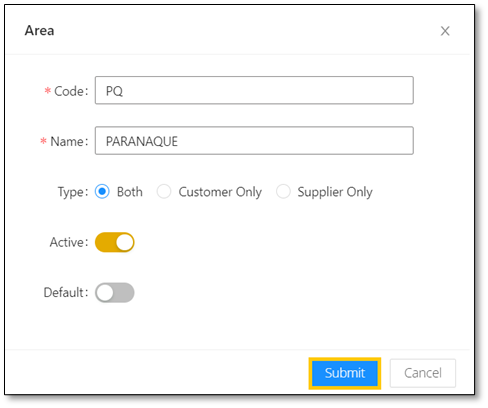 Default: This is a function that allows you to set the area as default in supplier and customer maintenance based on the type.