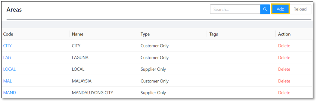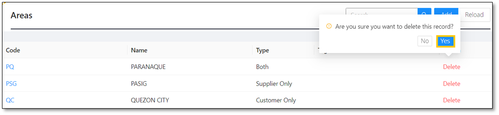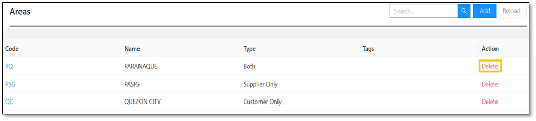 Note: An area can only be deleted if the area has not been tagged in a customer and supplier with transactions.