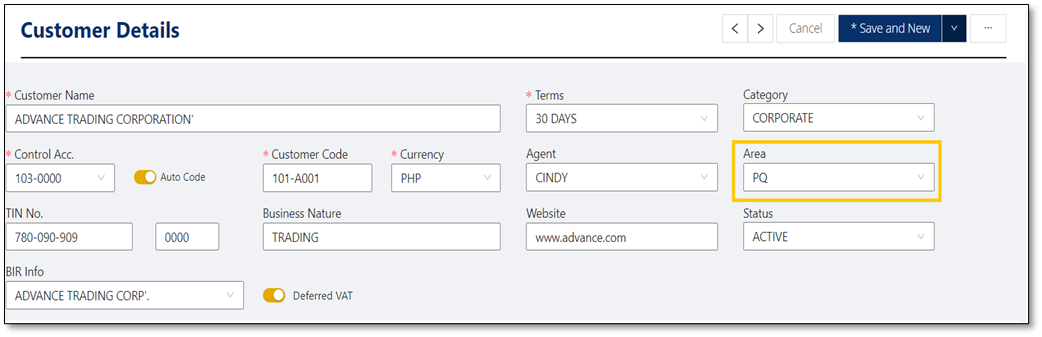 Area can now be used in customer and supplier maintenance.