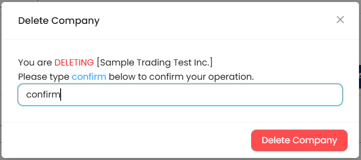 3. When the Delete Company confirmation is prompted, type "confirm" in the text box, then click Delete Company.