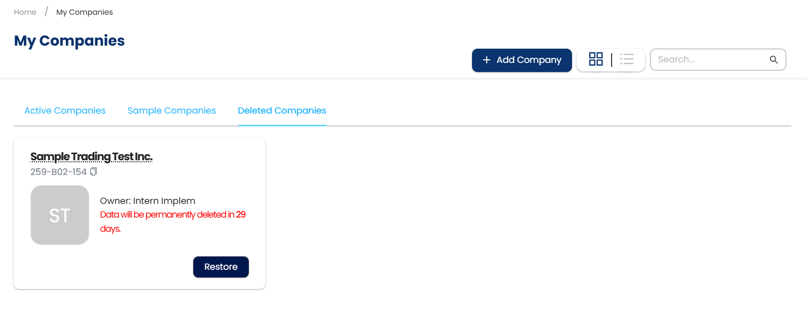 Deleted companies will be moved to the Delete Companies tab and will be deleted permanently within 29 days.