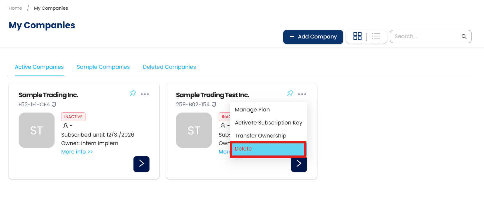 2. In My Companies > Active Companies. Click Plan > Delete.