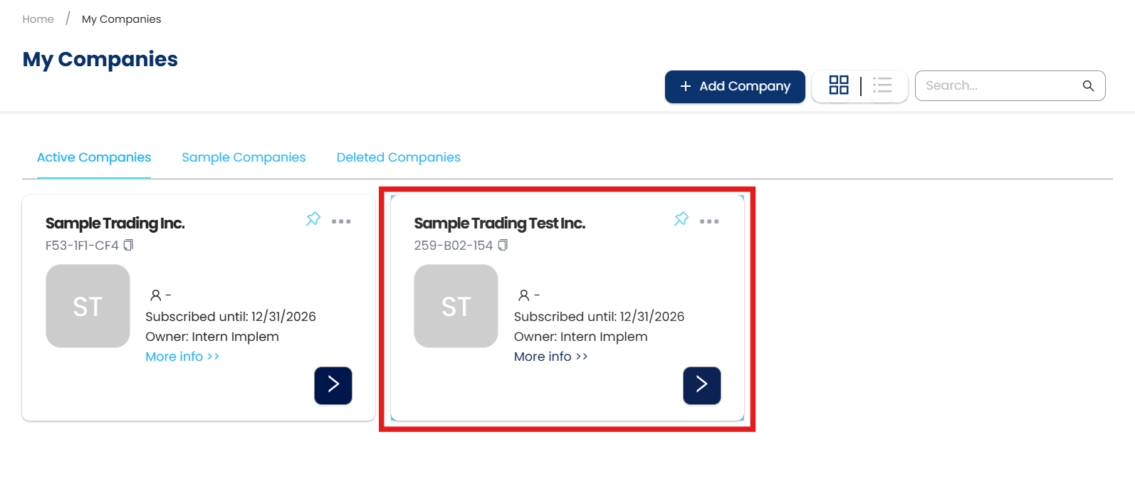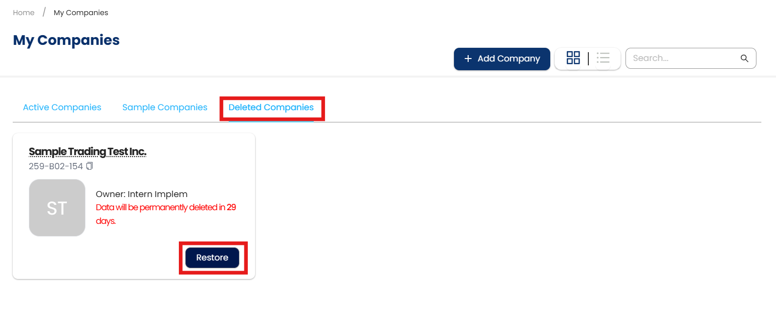 2. In My Companies, go to the Delete Companies tab. Click Restore