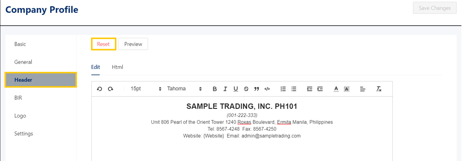 2. In the Company Profile, go to the Header tab then click Reset