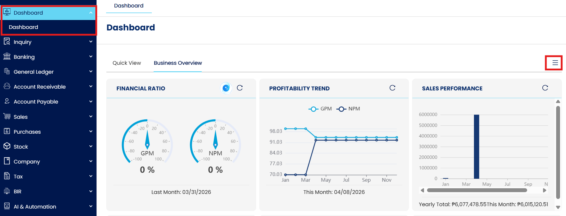 In the Navigation pane, go to Dashboard. Click the three lines located in the upper right corner of the screen.
