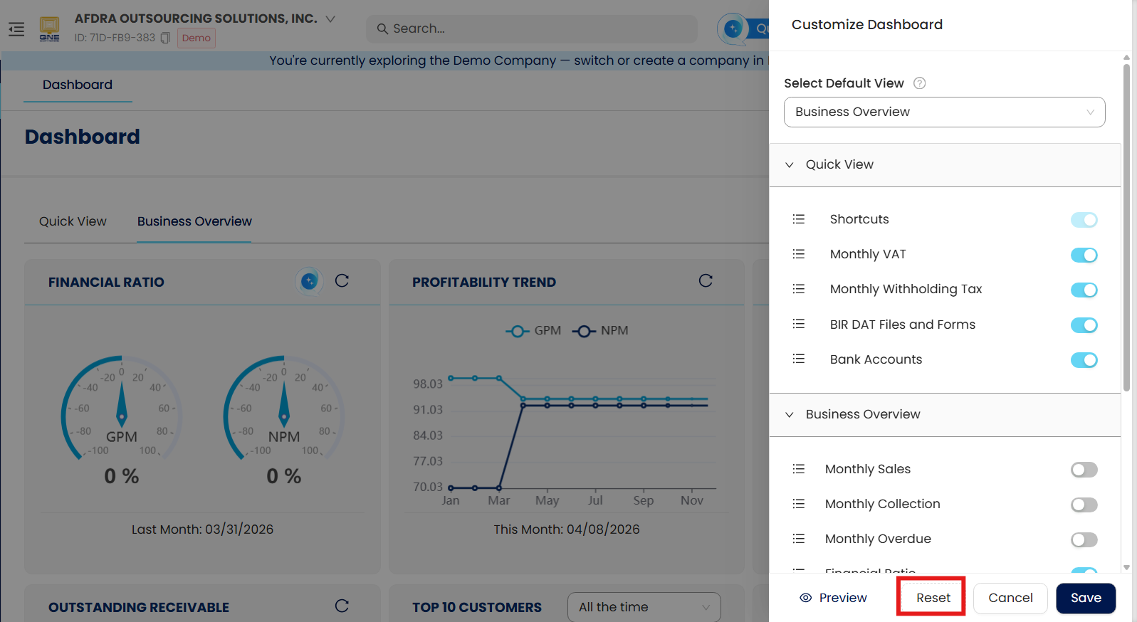 In the Customize Dashboard Pop-up box, click Reset.