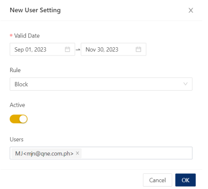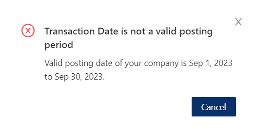 Block – Unable to proceed with the saving of the transaction if it's outside the valid posting date.