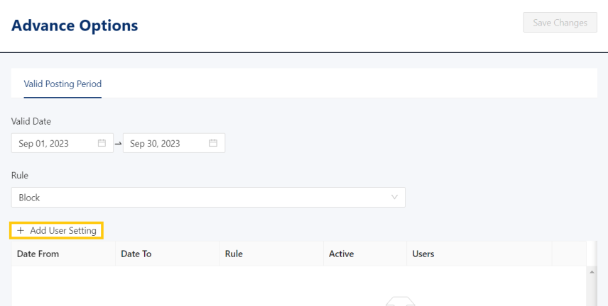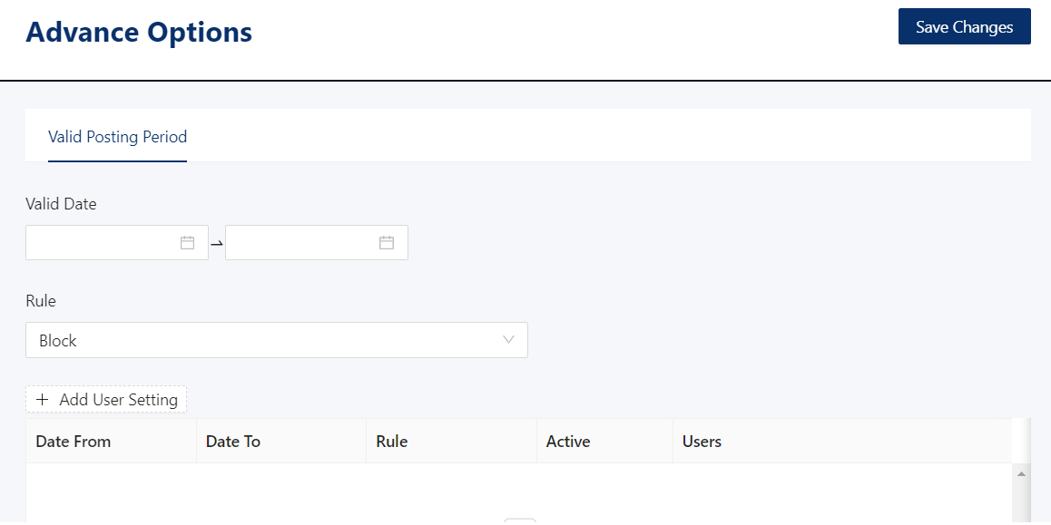 Valid Posting Period allows the user to control the posting of account entries based on the set valid dates in the system. By using the Valid Posting Period, it may limit the encoding of Backlog Transactions or Advance Postings. This function can be set up for all users or for a specific user only.