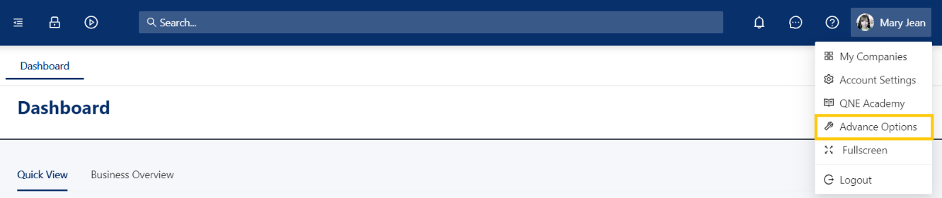In the system's Header, click 'Account Option,' then choose ‘Advance Options.'