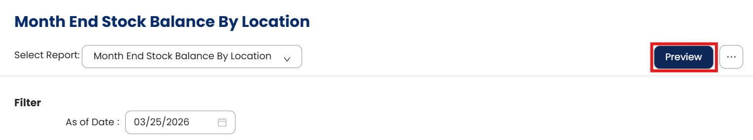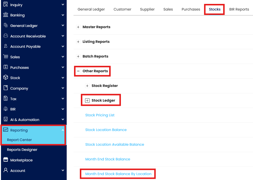 On the Navigation Pane, go to Reporting > Report Center. Under the Stocks tab, click Other Reports > Month End Stock Balance By Location.