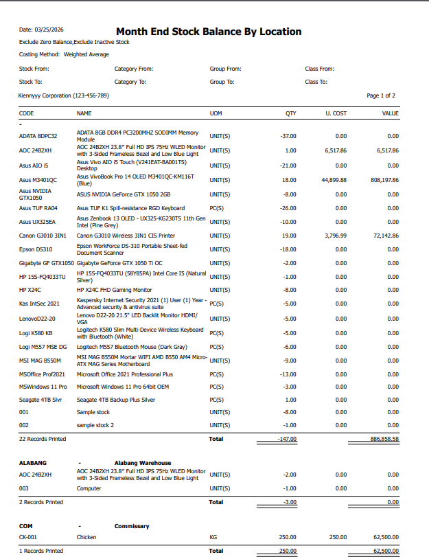 The Month End Stock Balance by Location Report enables users to generate an inventory report to show the remaining balance with values grouped by location.