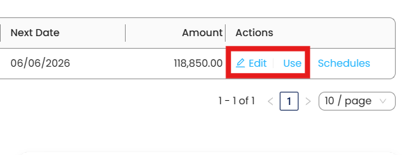 Under the Recurring Transaction List, you may Edit the recurring setup or Use the template even if it is not yet scheduled.