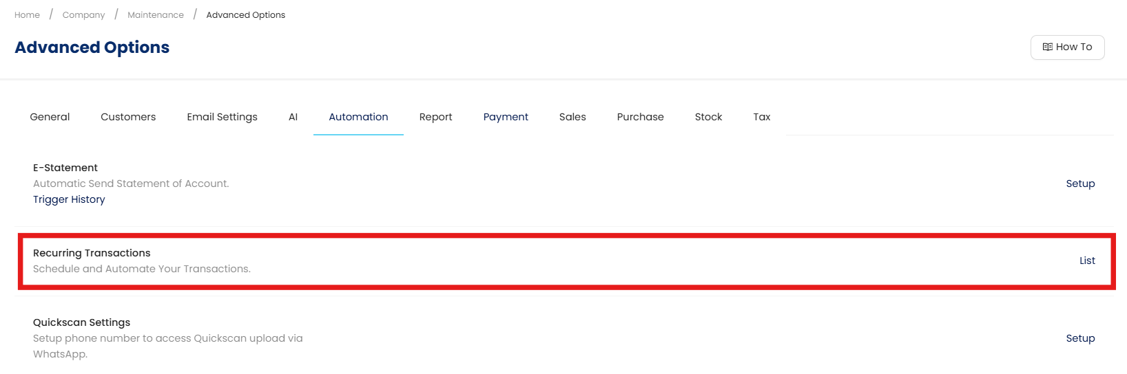 Click Recurring Transactions and then click the List button to view all active recurring