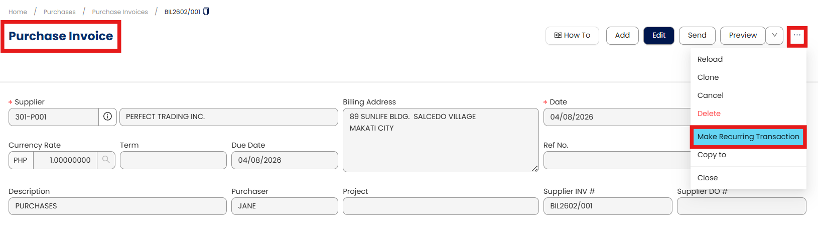 Open the transaction you want to make recurring (e.g., Sales Invoice, Purchase Invoice, or Expense).
