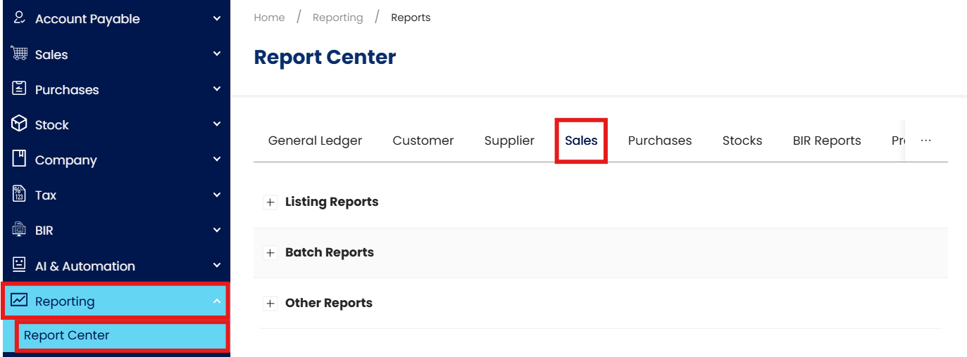 On the navigation pane, go to Reporting > Report Center and navigate to the Sales tab.