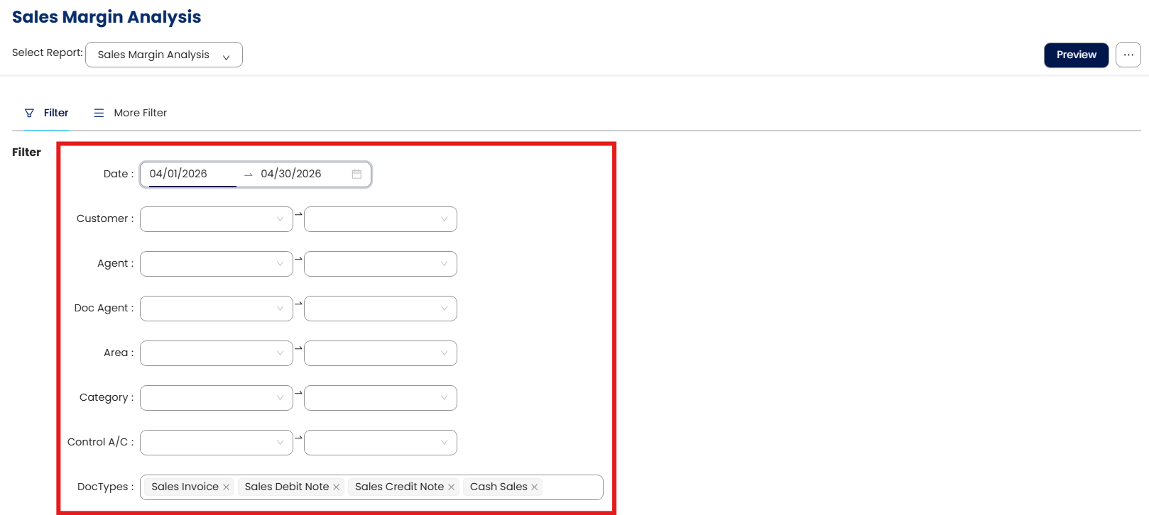 DocTypes: Choose which document types to include in the analysis (e.g., Sales Invoice, Sales Debit Note, Sales Credit Note, Cash Sales).