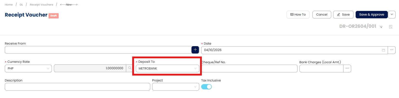 When you create a receipt voucher, the system will automatically populate the Deposit To field using the configured default bank account.