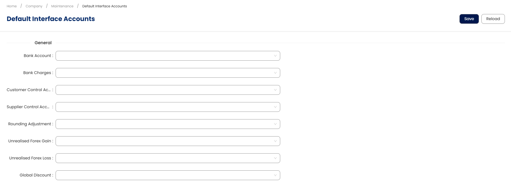 You are not required to configure all default accounts — only those relevant to your company’s processes. For each section, use the dropdowns to define the appropriate GL account. The system will display only compatible options based on each account’s classification in your Chart of Accounts.
