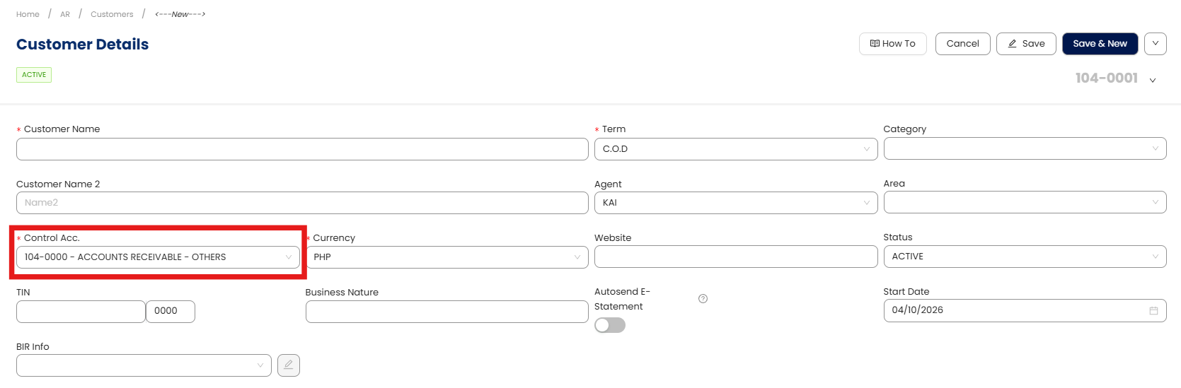When adding a new customer, the Control Account field will auto-fill with the defined customer control account, ensuring all receivables are properly tracked.