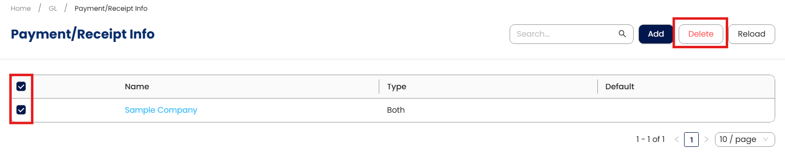 In the Payment/Receipt Info List View, tick the checkbox beside the item you wish to delete, then click Delete.