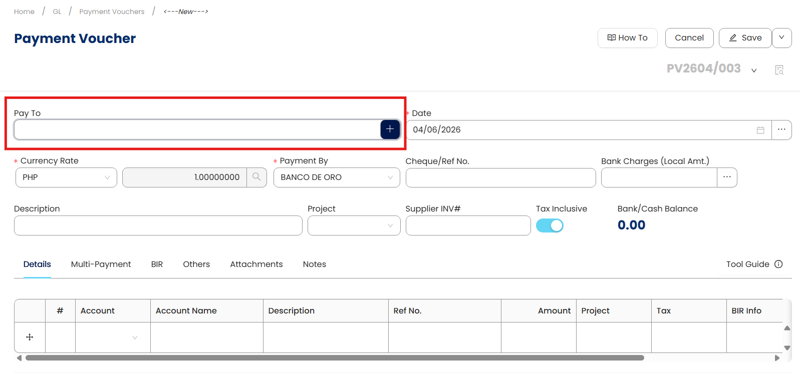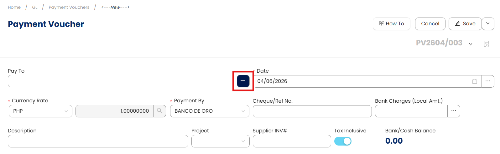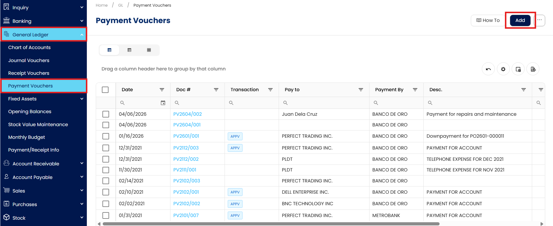 Go to General Ledger > Payment Vouchers.