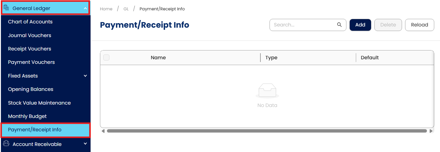 Go to General Ledger > Payment/Receipt Info.
