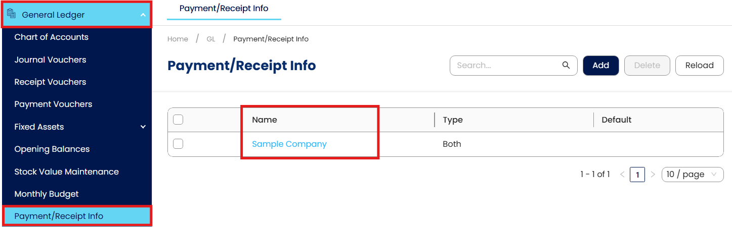 Go to General Ledger > Payment/Receipt Info, then select the Name of the Payment/Receipt Information that you want to update.