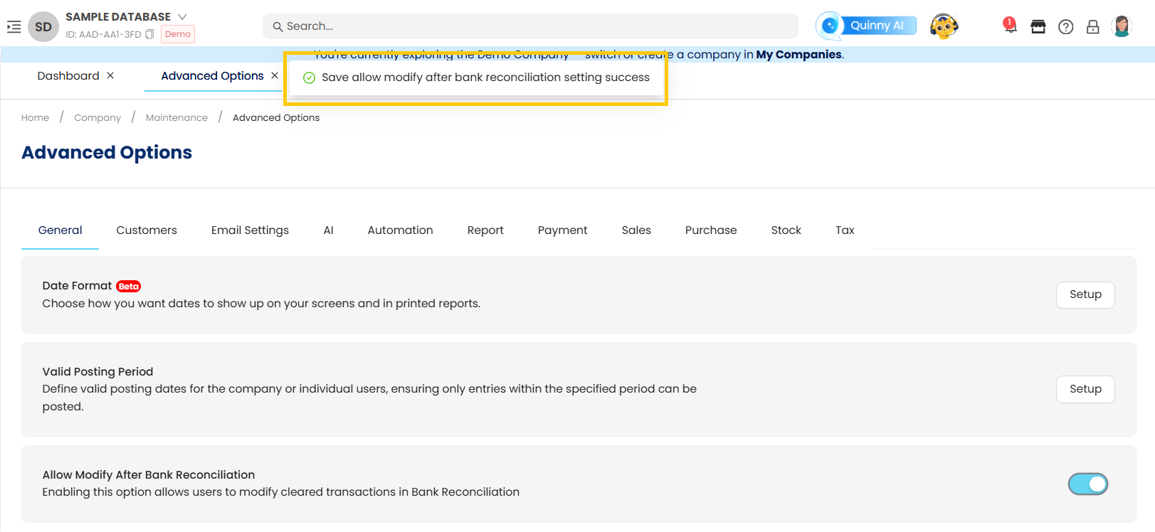 For example, after reconciling a set of bank transactions, the finance team realizes that one transaction has the wrong payment reference. Instead of undoing the reconciliation process, they enable the Allow Modify After Bank Reconciliation setting to directly amend the reference field. This flexibility ensures accurate reporting without the need to reprocess bank reconciliations.