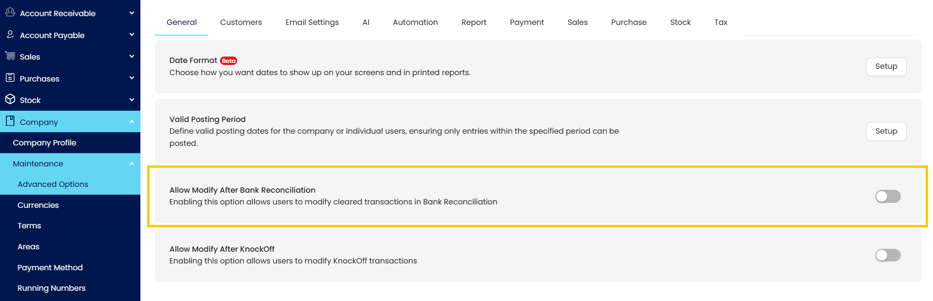 In the Advanced Options list, look for the toggle labeled Allow Modify After Bank Reconciliation and enable the option.