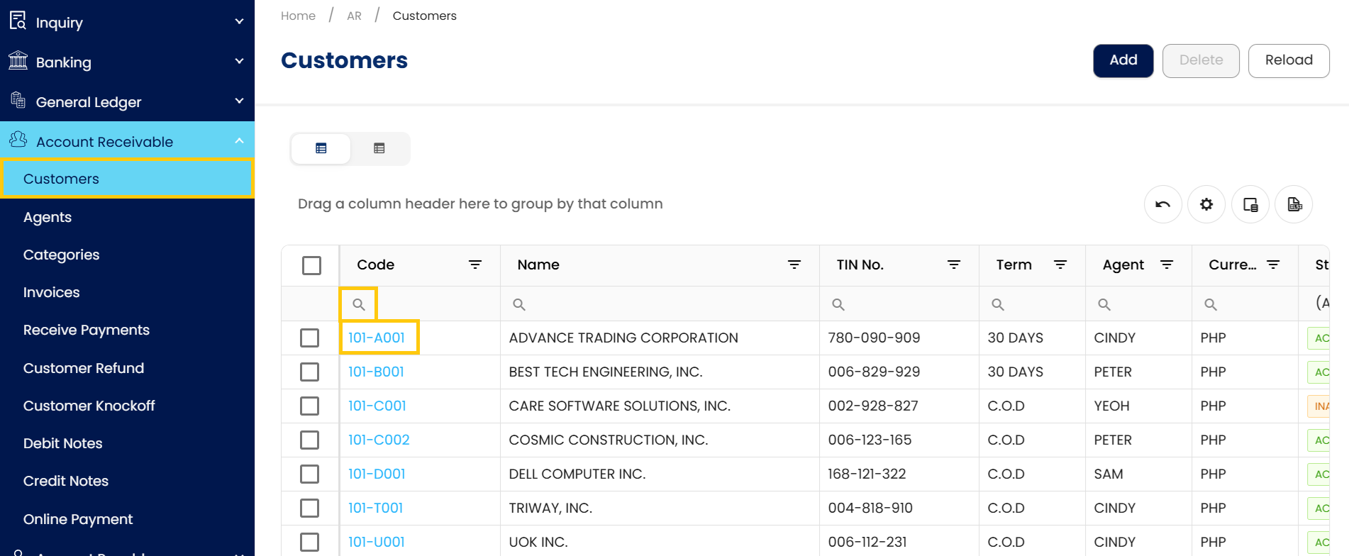Alternatively, use the search bar to quickly find the customer, then click the Customer Code to begin editing.