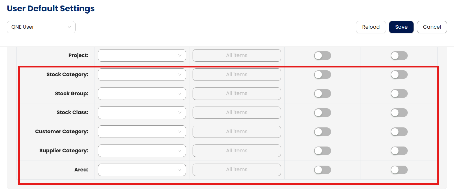 Additional Transaction and Report Filter Section: Below the default settings, there is an additional section that applies the same configuration controls to transaction classifications and report filtering. This ensures consistency between transaction entry and report visibility.