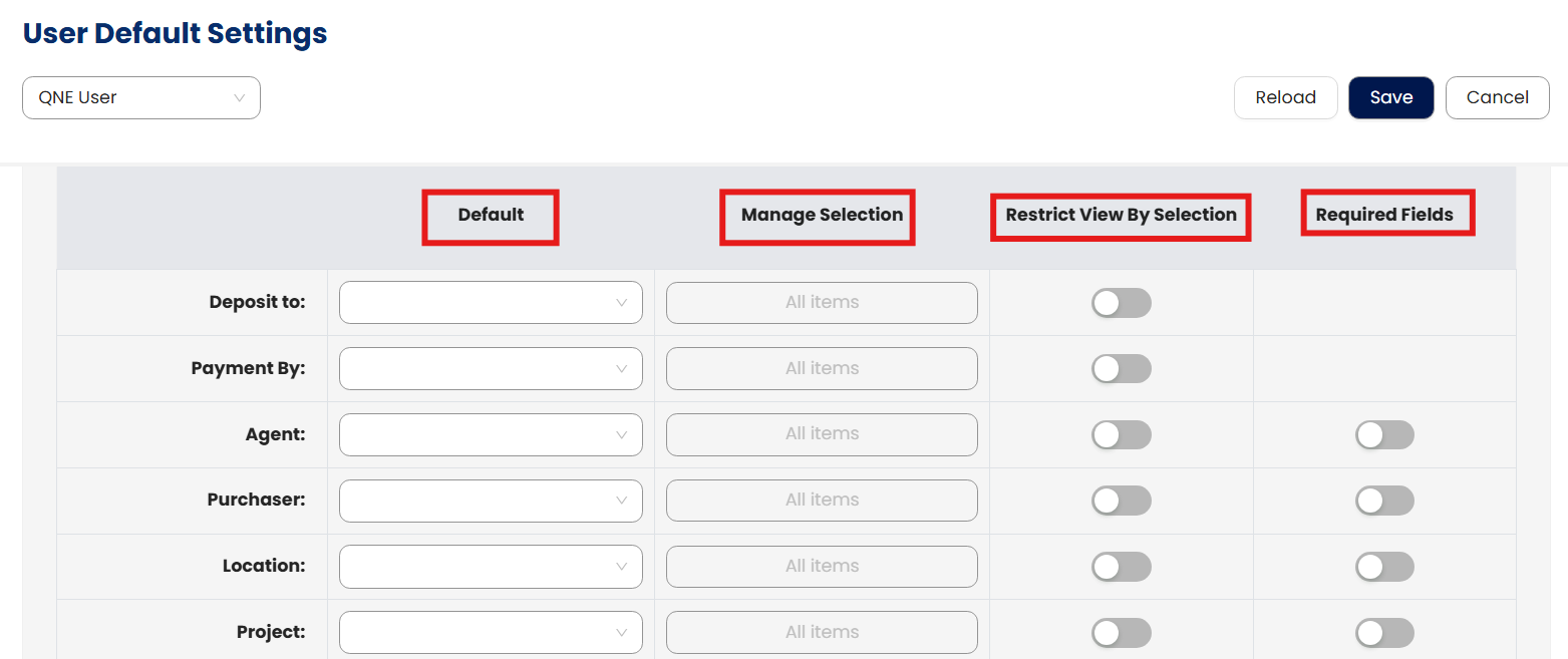 Default: This column allows you to assign the default value that the user will see when performing transactions. For example: