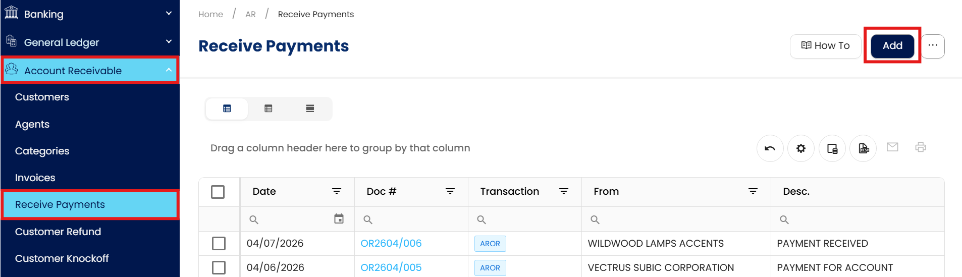 Click Add to begin a new transaction.