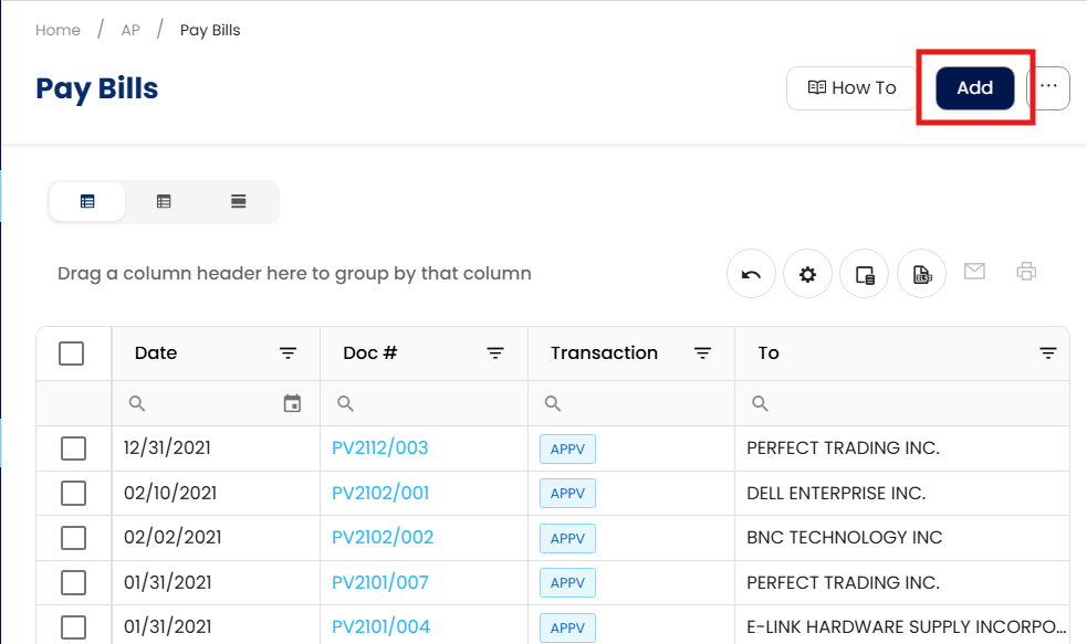 Once inside the Pay Bills module, you’ll see a list of all previous Pay Bills transactions. Click the Add button to begin creating a new payment entry.
