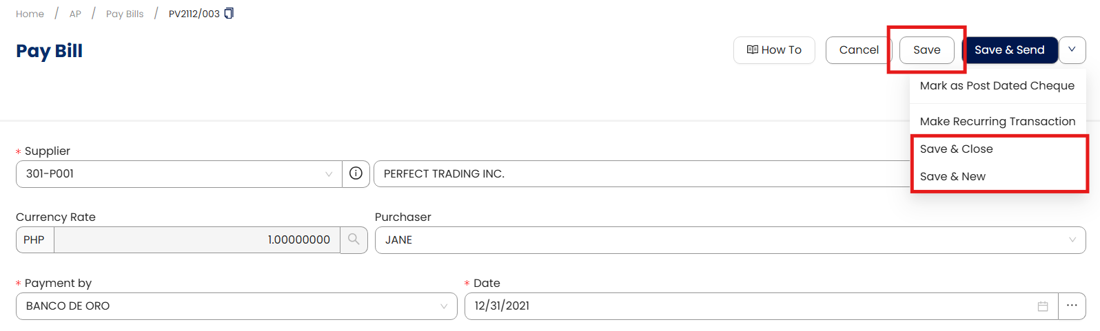 Once all required fields are completed and you've matched the APV(s), click Save to finalize the transaction.