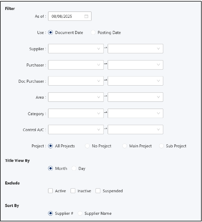 The Accounts Payable Officer is preparing for the monthly disbursement planning meeting. To identify which suppliers need immediate payment, the officer generates a Supplier Aging Report as of August 8, 2025. This report highlights overdue balances and helps prioritize payment scheduling