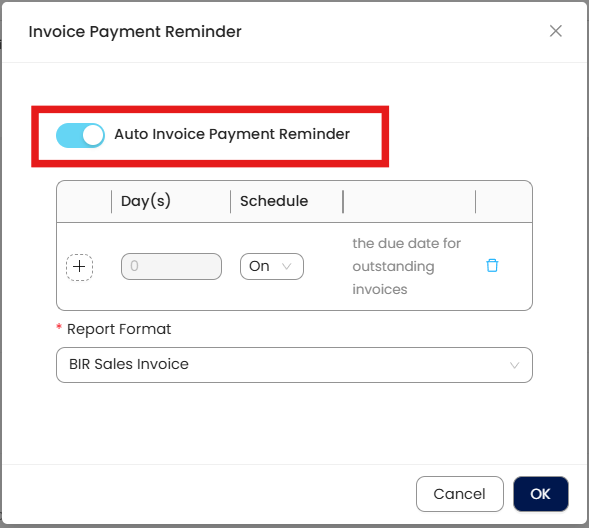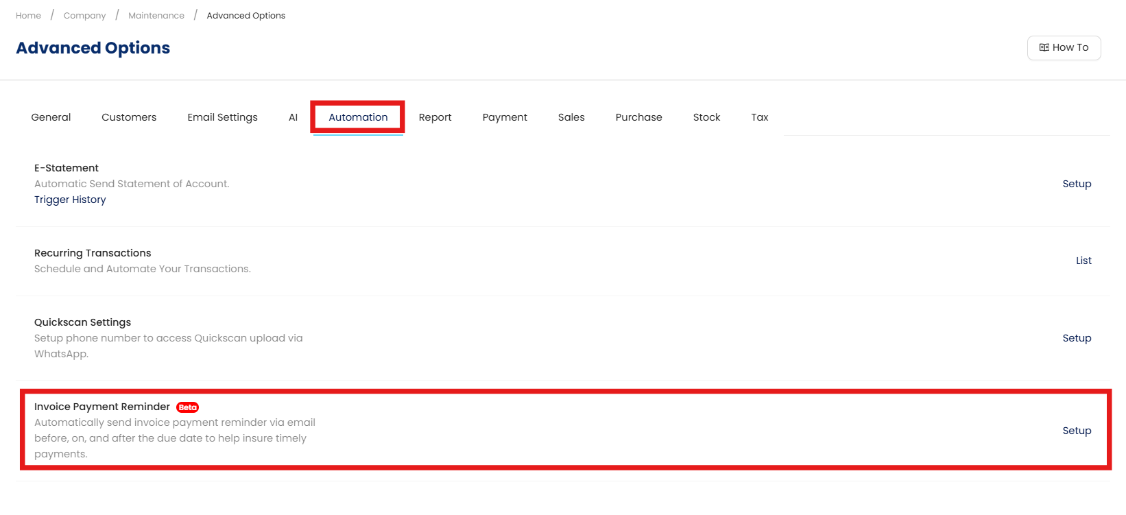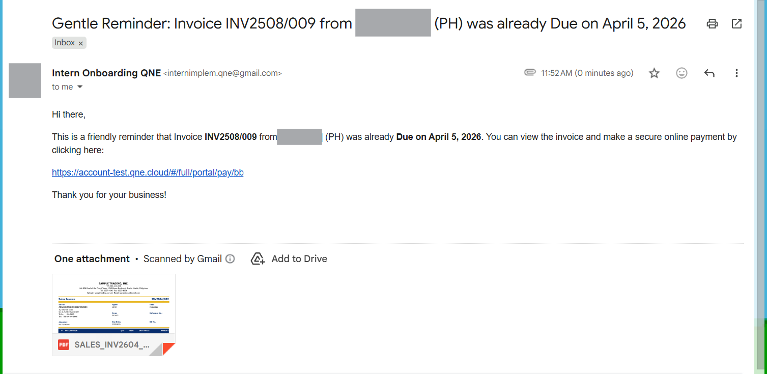Test the setup by creating a sample Sales Invoice under Sales > Sales Invoices > Add, selecting the customer, and verifying that the reminder email is sent with your custom message. (Optional) Once saved, invoice reminders will automatically send to the designated customer email addresses with your chosen timing and content.