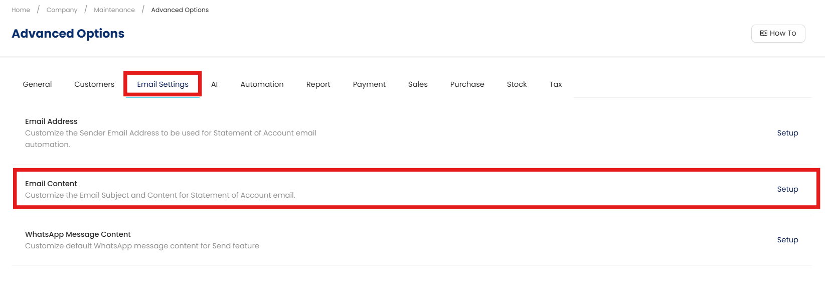 Go to Advanced Options > Email Settings > Email Content. Click Setup.
