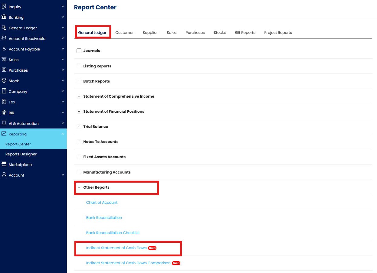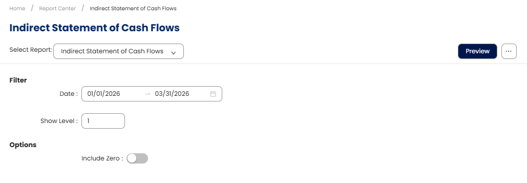 Go to Reporting > Report Center > General Ledger > Other Reports > Indirect Statement of Cash Flows.