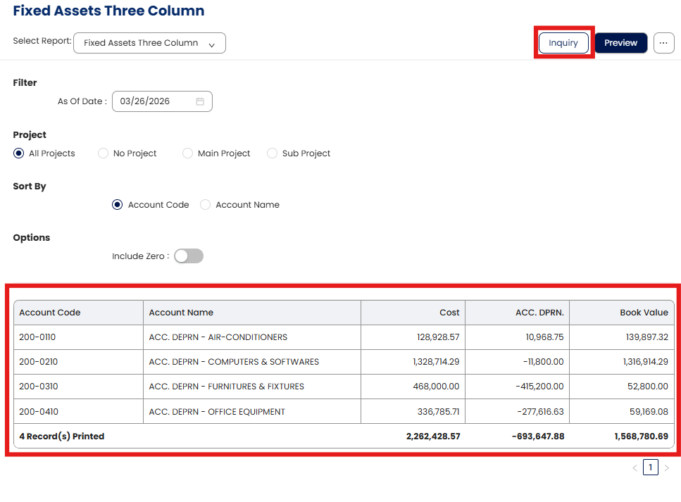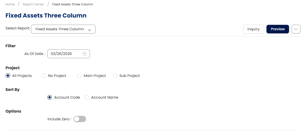 Include Zero – Turn ON to display assets with zero balances (e.g., fully depreciated assets).