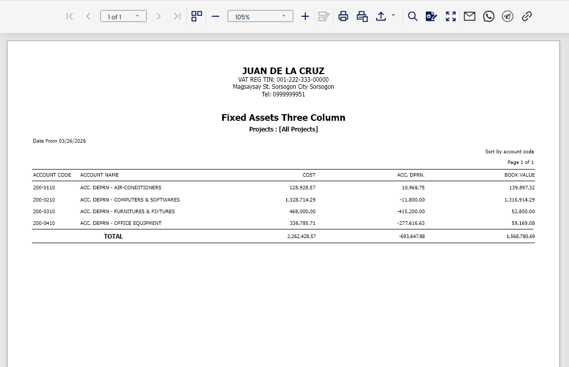 The Fixed Assets – Three Column Report in N3 AI Accounting provides a snapshot of asset balances by displaying three key figures: original cost, accumulated depreciation, and net book value. This report helps businesses track asset valuation, manage depreciation schedules, and ensure accurate and transparent financial reporting.